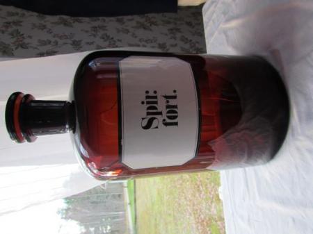 Brun flaska med glaskork och etikett: Spir.fort.