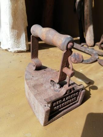 Strykjärn i järn och handtag i trä.