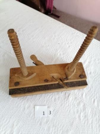 Hyvel av trä med justerbar skruvsystem. Årtal 1843. Donator Guy Lassanders far var snickare i Amerika. Hyveln kan ha sitt ursprung där.