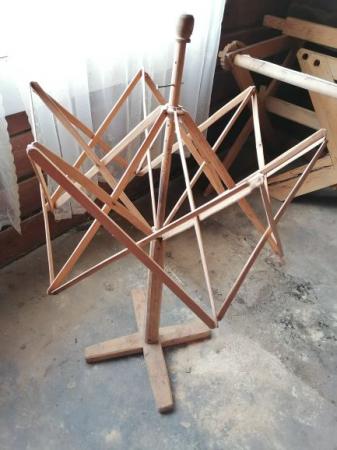 Nystkrona av trä och ståltråd. Används för att nysta härvor.