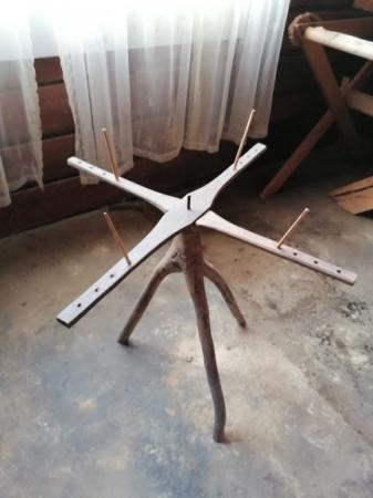 Härvel av trä. Används för att snurra garn eller tråd.