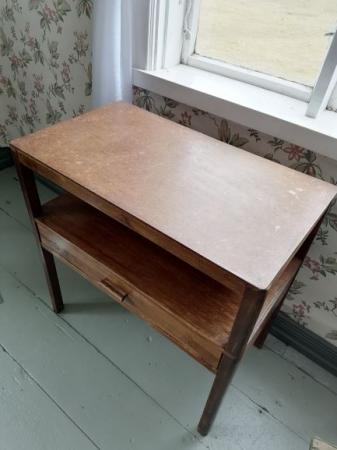 Bord av trä och spånskiva. Har en utdragbar låda.