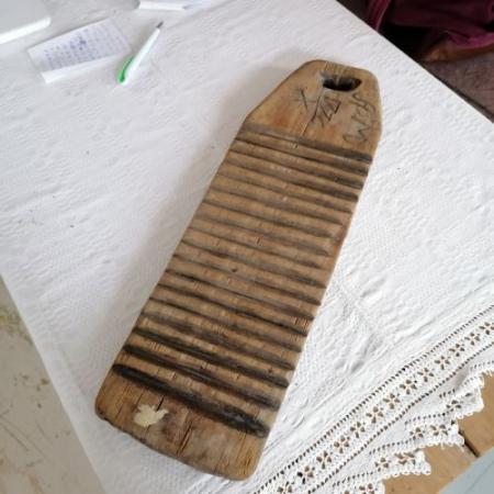 Valkbräde av trä. Skuren ur ett stycke trä. ANvändes vid valkning av ylletyger. Bomärket tillhör Lassela. DAterat 1776.
