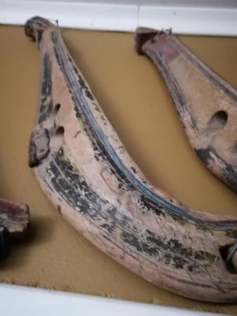 Rankhalva av trä och läder. Svartmålad - även röda, mörkblå och gula färfragment. Målet är mycket slitet. Användes för vinterbruk.