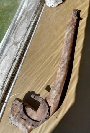 Specialverktyg som användes för att hålla fast och böja bräder vid båtbygge. Verktyget är gjort av trä och två hästskor och härstammar från borgåtrakten.