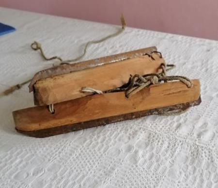 Skridskor av trä, sågblad och band. Användes genom att spännas fast utanpå vinterskorna.