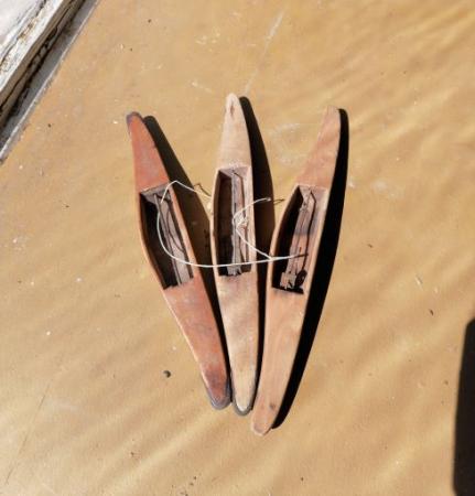Tre vävskyttlar av trä och metall.