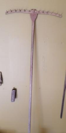 Räfsa av trä. Användes för gräs (jämför 99). Skaftet av (har varit längre).