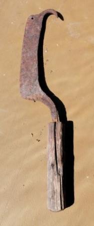 Granrishacka av järn med träskaft. Hackat granris användes som underlag för hästar.