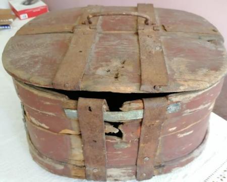 Resvacka av trä med järnbeslag. Nya metallstöd har lagts till.