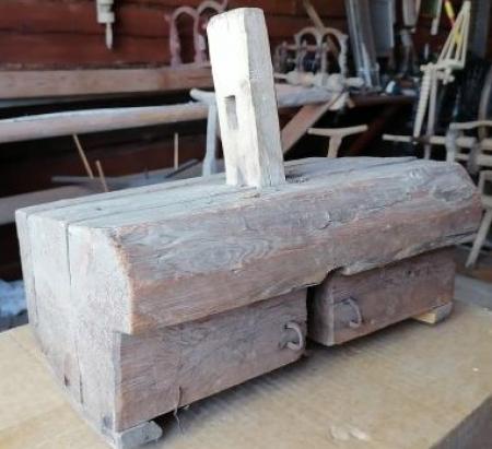 Trädel av skrubelsäte. Användes vid ullberedning. Otydlig stor text med blyerts på undre sidan.