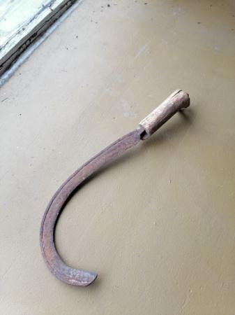 Lövkasse av järn med handtag av trä. Användes för att skära kvistar med löv till foder åt fåren.