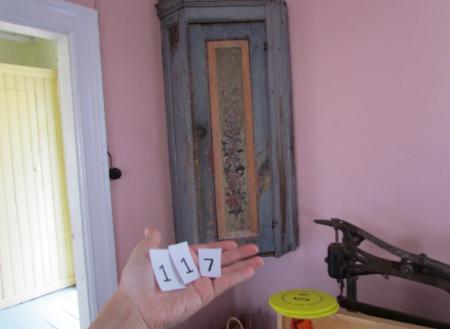 Hörnskåp av trä. Målat ljusblått/grått.