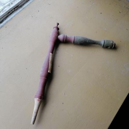 Linställ av svarvat trä. Målad i mörkrött och grönt.
