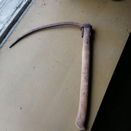 Hötag av järn med skaft av trä. Användes för att få större famn hö buret per gång.