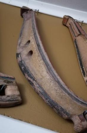 Gjord av tä. Målad i gult med mörka och röda dekorationer. Användes vid vinterbruk.