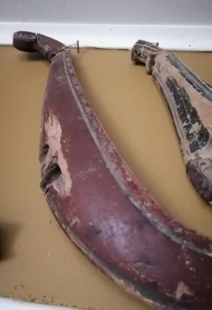 Rankhalva av trä med läder och metalldelar. Målad i rödbrunt med blåa färgfragment. En bit saknas längst ner. För vinterbruk.
