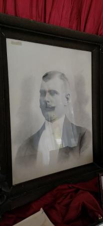 Gjord av Leonard Roine. Fotografiet har blyertstecknad bakgrund. Alfred Andersson kom från Amerika ca 1905-06 och donerade pengar till Kovjoki samlingshus.