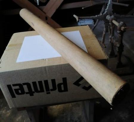 Kavelstock av trä. Användes vid mangling tillsammans med kavelbräde (se 240). rester av läder fastspikad i ena gaveln.