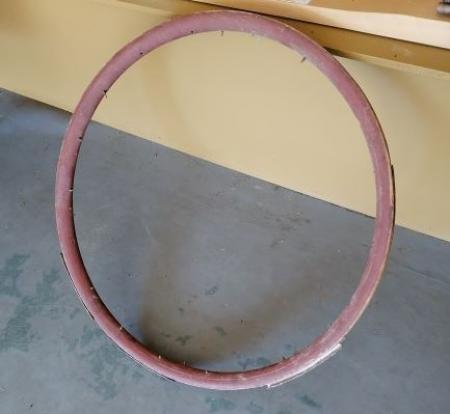 Cykelhjul av trä och metall. Ekrarna och ringen fattas.